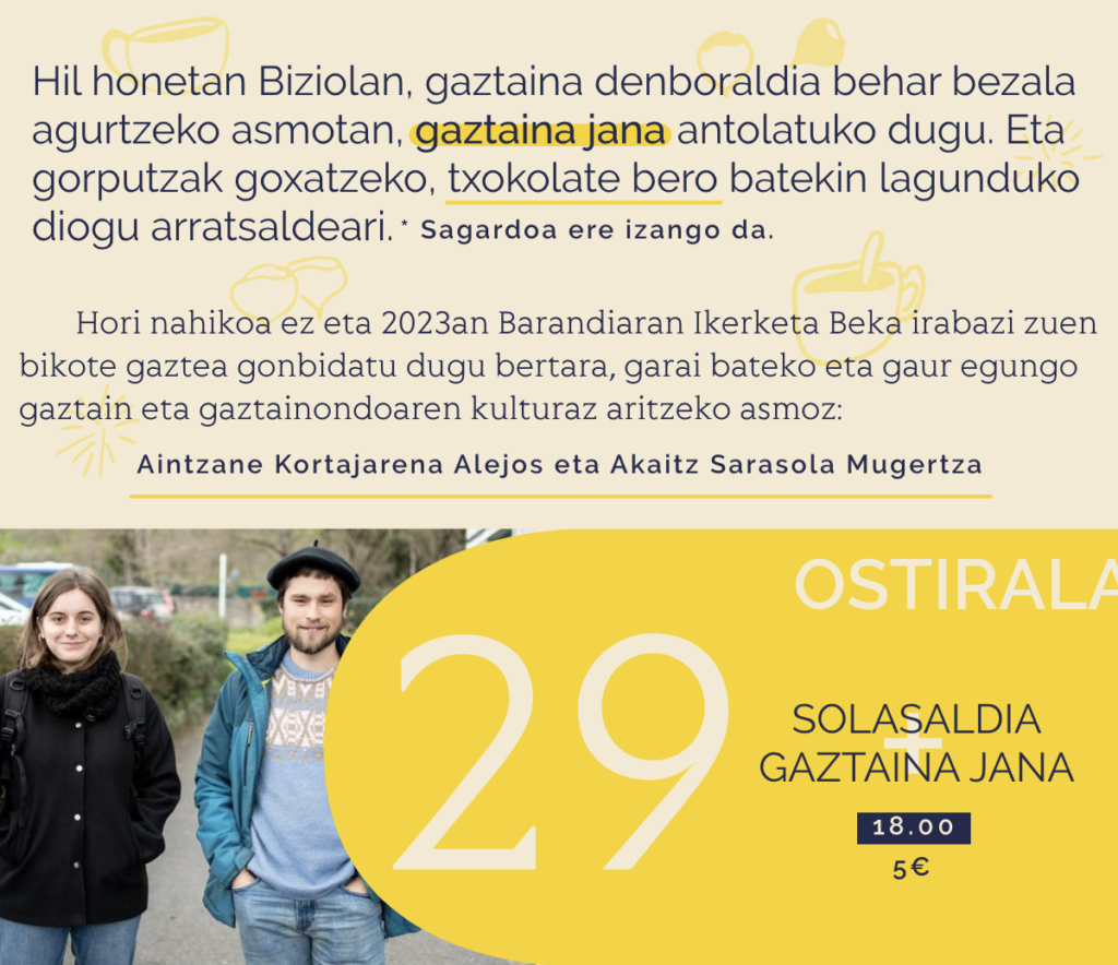 Gaztaina jana eta solasaldia AZAROAK 29 I 18:00 I 5€ Izen abizenak(Beharrezkoa) Telefono zenbakia(Beharrezkoa) Helbide elektronikoa(Beharrezkoa) Zenbat izango zarete?(Beharrezkoa) Egiteko txokolaterako behi esnea hartzeko arazorik duzu? Pribatutasun politika(Beharrezkoa)Emandako informazioa Biziola Koop. S erakundeak zure eskaera erantzuteko erabiliko duela adierazten dizugu. Emandako datuak harreman komertziala mantentzen den bitartean edo legezko eginkizunak betetzeko behar den denboran zehar gordeko ditugu. Legitimizazioa zure baimenaren bidez lortzen da. Datu hauek ez dizkiegu hirugarrenei emango, lege-betebehar bat dagoen kasuetan izan ezik. Zure erabiltzaile-eskubideak baliatu ditzakezu info@biziola.eus helbidera idatziz. Pribatutasun politika irakurri dut eta onatzen dut